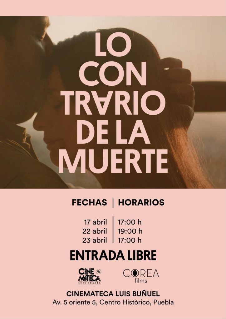 La película Lo contrario de la muerte será proyectada en la cinemateca Luis Buñuel (5 Oriente 5 , Centro, Puebla) el miércoles 22 de abril a las 19 horas y el jueves 23 de abril a las 17 horas con entrada libre.