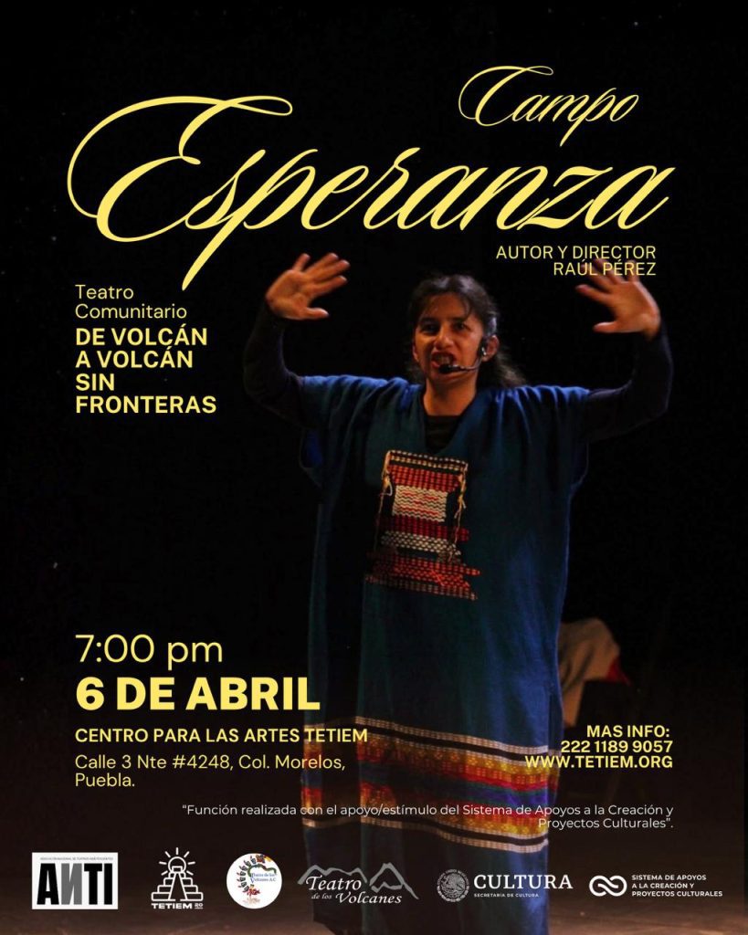 El Centro para las Artes TETIEM será sede de la presentación de la obra Campo esperanza, a cargo de la compañía Teatro Comunitario de Los Volcanes, como parte de su gira “Teatro comunitario de volcán a volcán sin fronteras”.